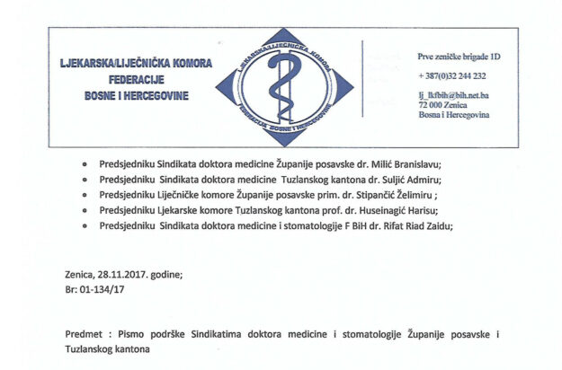 Pismo podrške Predsjednika Ljekarske/Liječničke komore FBiH prim. dr. Haruna Drljevića NovostiOd Sindikat1. Decembra 2017.